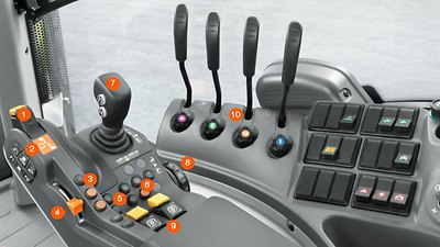 Podłokietnik fotela jest regulowany na wysokość i podłużnie odpowiednio do potrzeb operatora. Wszystkie często używane funkcje znajdują się na wielofunkcyjnym podłokietniku.